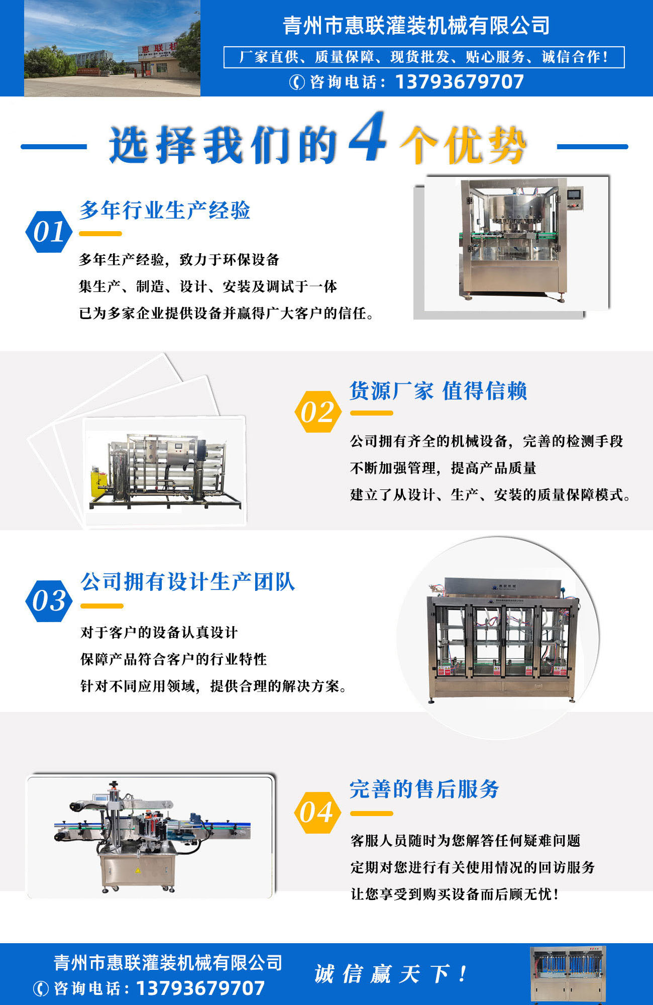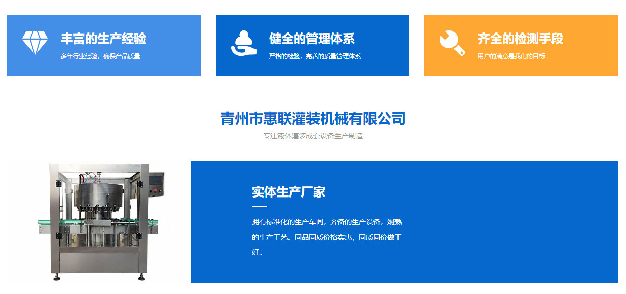 青州市惠聯(lián)灌裝機械有限公司是一家集生產(chǎn)研發(fā)、銷售、服務于一體的液體灌裝成套設備生產(chǎn)企業(yè),可根據(jù)廠家要求設計合理液體灌裝生產(chǎn)線,為用戶提供技術咨詢、設計工藝、場區(qū)平面布置、工藝改造、設備安裝調試等完善服務。 公司生產(chǎn)制造各種類型液體灌裝機、過濾機,水處理設備及液體灌裝成套設備。主要產(chǎn)品有:白酒、葡萄酒、黃酒等酒水灌裝機、食用油、機油、潤滑油等油類灌裝機、醬油醋、老抽、生抽等調味品灌裝機、防凍液、玻璃水灌裝機、酒精、84消毒液灌裝機、車用尿素灌裝機、口服液灌裝機、洗滌劑灌裝機等多種液體、膏體灌裝設備,全自動/半自動灌裝機型號多,規(guī)格全,洗瓶機、瓶子封口機、打塞機、熱縮機、瓶子烘干機、貼標機、噴碼機、輸送線、裝箱機、水處理設備等全套生產(chǎn)線相關配套設備齊全,自產(chǎn)自銷,一站式購齊,售后無憂。